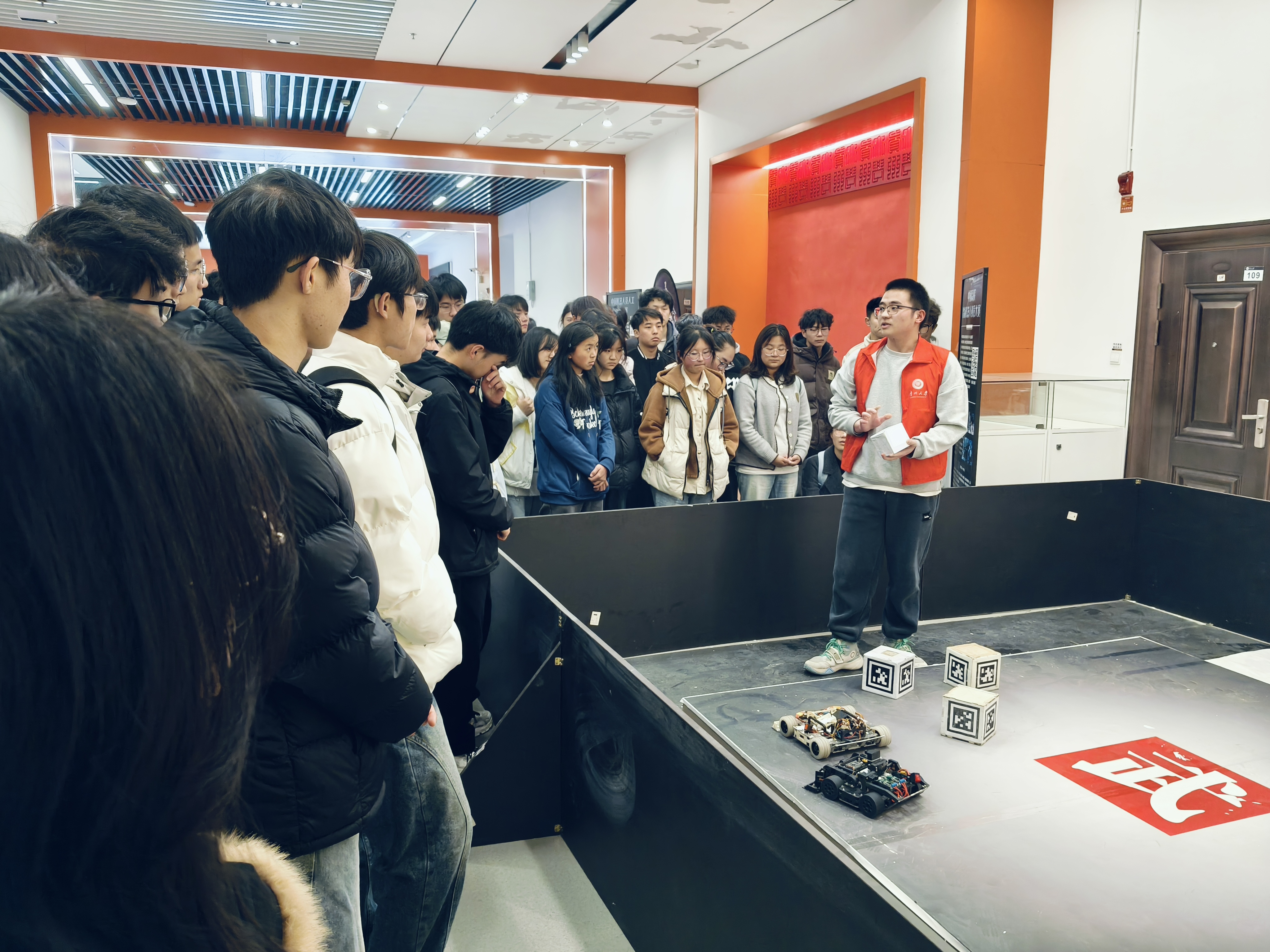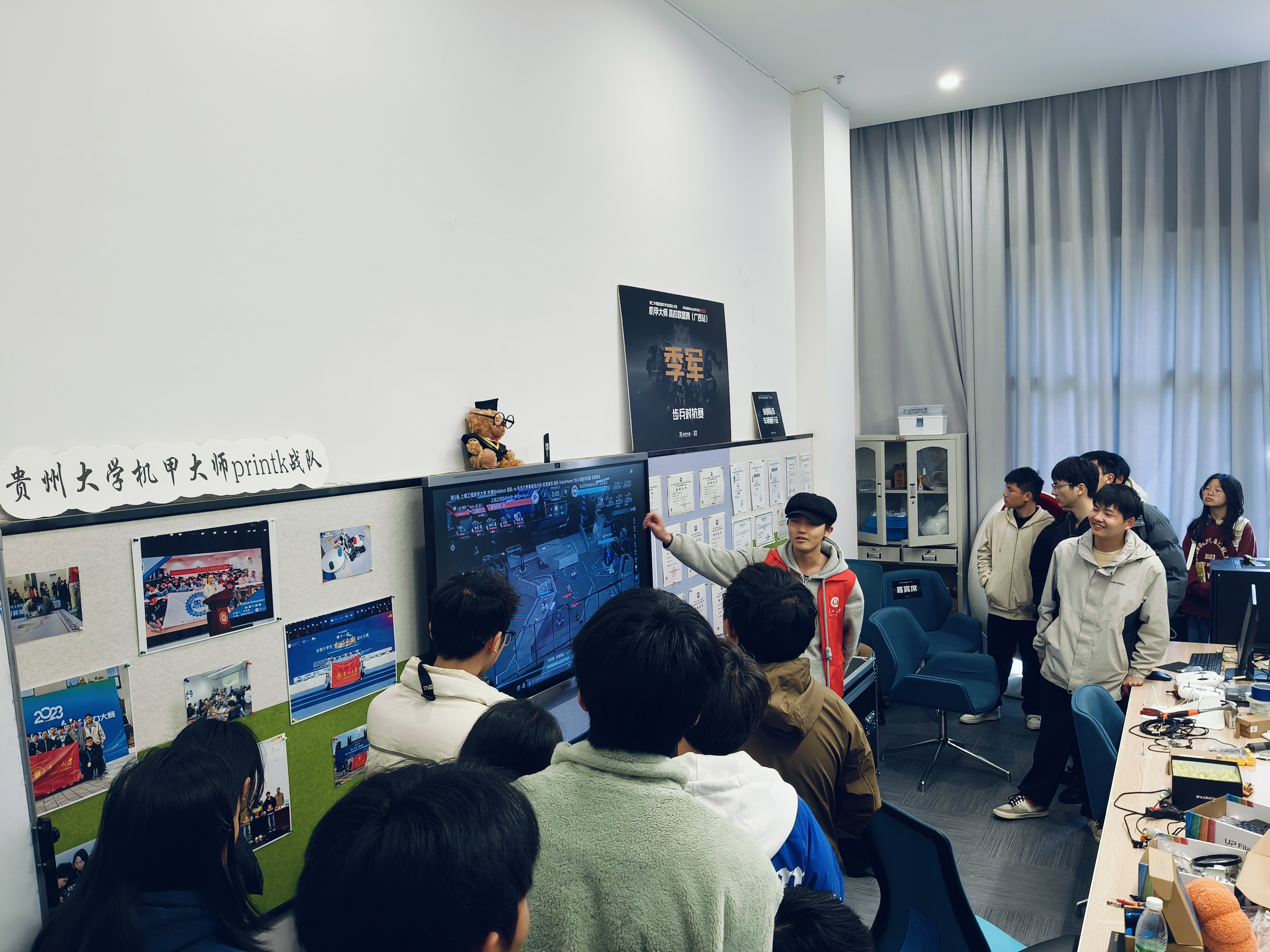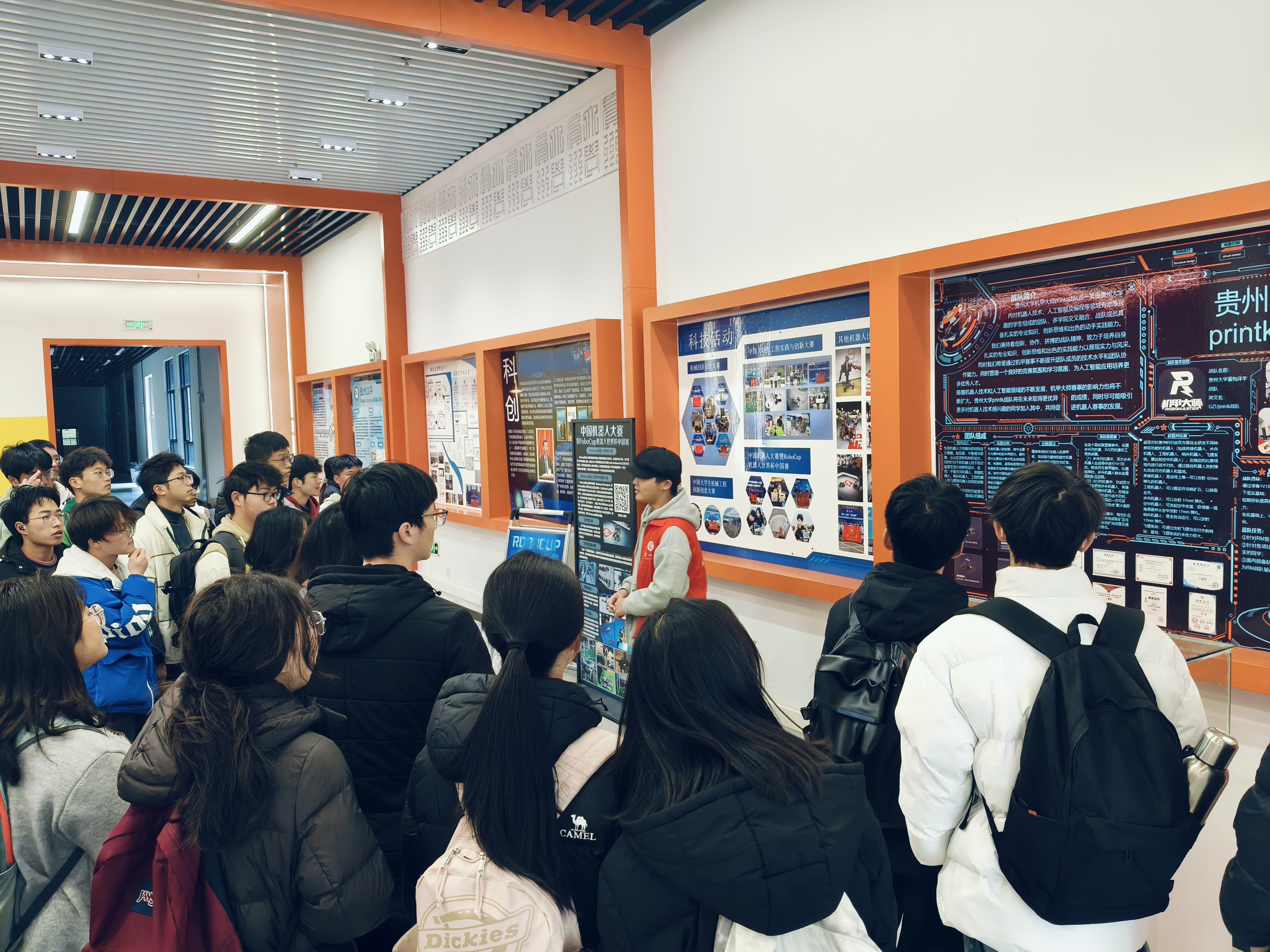 正式介紹優(yōu)秀作品前,馭想俱樂部負責人楊春白雪向同學們介紹習近平總書記給中國國際大學生創(chuàng)新大賽參賽學生代表回信內(nèi)容。隨后楊春白雪和機器人社團負責人田景怡分別對兩個科創(chuàng)社團進行了介紹并對相關賽事進行解讀,還向大家展示了貴州大學代表隊的獲獎作品。在參觀robomaster工作室時,獎杯墻令人震撼。同學們表示一個個獎杯背后的故事更令人欽佩,激勵機械青年守正創(chuàng)新,再創(chuàng)佳績。